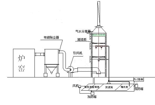 煙氣通過布袋除塵器后,99%的塵埃被除去,由自動卸灰器排出;煙氣在引風機的作用下,進入噴淋霧化裝置,當洗滌水中加有堿液時(PH值≥9),堿液良好的霧化,當二氧化硫氣體通過文丘里時候,能夠很好的與堿液混合反應,達到初步的脫硫效果。此后煙氣進入脫硫塔筒體進入脫硫塔底部沖擊器,流速為17m/s的氣流高速沖擊塔內液面而產生密集氣泡,使細微塵埃落入循環液中,部分SO2氣體與堿液發生中和反應;煙氣在旋流板的作用下旋轉上升,以延長煙氣在塔內的滯留時間;密集型強霧化置在塔內形成全霧化氣幕,使煙氣與堿液充分接觸,完成完全的中和反應,達到***脫硫的目的。被水霧濕潤的塵粒流到脫硫塔底部,從溢流孔排走。在筒體底部封底并設有水封槽以防止煙氣從底部漏出,有清理孔便于進行筒體底部清理。脫硫后廢水由底部溢流孔排出進入沉淀池,沉淀中和,循環使用。帶水煙氣上升到上層旋板時,部分濕潤煙氣由于旋流板的作用,產生氣水分離,然后進入格刪型脫水裝置,實現更***的汽水分離,潔凈煙氣進入煙囪排入大氣。