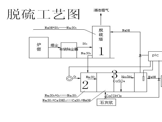 煙氣進入脫硫塔①氫氧化鈉發生中和反應,主要生成物亞硫酸鈉,亞硫酸鈉極不穩定,進入氧化池②與氧氣發生反應,生產穩定的硫酸鈉,硫酸鈉與石灰水在綜合反應池③內發生復分解反應,生成石膏(沉淀)和氫氧化鈉,實現再生利用。